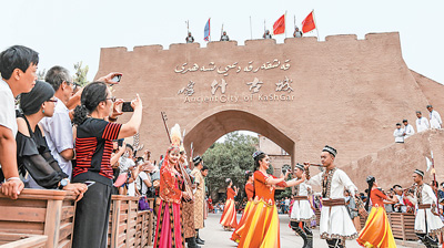 在新疆喀什古城景区“开城”仪式上,游客在观看歌舞表演(8月13日摄)。
