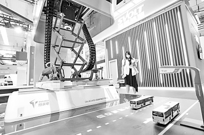 2022世界新能源汽车大会上,一位参观者在参观一款面向无人驾驶自动客车的柔性充电弓。新华社发