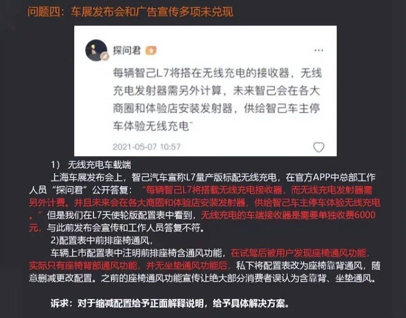 问题四聚焦在车型具体功能,首先是前期宣传的车辆无线充电功能由标配变为需要花6000元选装,而前排座椅通风功能也仅仅是椅背通风,坐垫并无通风功能。