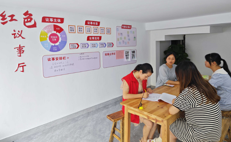 社区干部和居民在红色议事厅商讨社区改造事宜