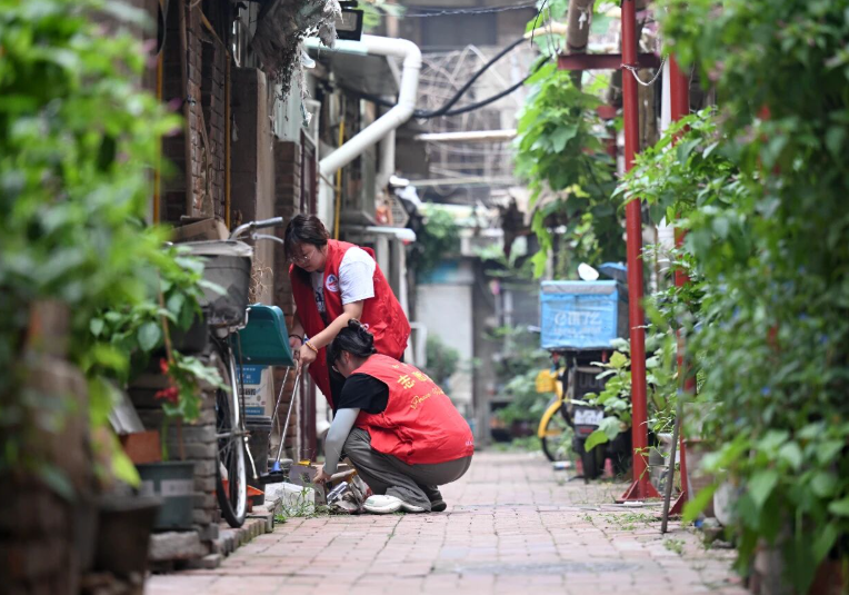 天津市和平区劝业场街道兆丰路社区工作人员和志愿者清理卫生死角 赵子硕 摄