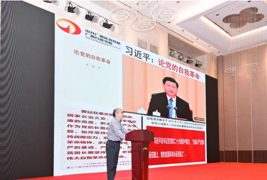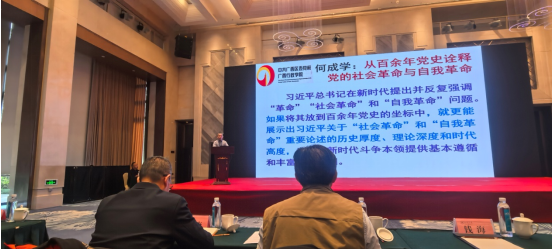 根据大会议安排,国务院特殊津贴专家、广西党史特聘专家、中国特色社会主义理论研究会理事、广西国史学会副会长、中共广西壮族自治区委员会党校马基地办主任何成学研究员作了题为:“从百余年党史诠释党的社会革命与自我革命”的主题学术演讲。何成学研究员在学术演讲中指出,习近平总书记在新时代提出并反复强调“革命”“社会革命”和“自我革命”问题。如果将其放到百余年党史的坐标中,就更能展示出习近平关于“社会革命”和“自我革命”重要论述的历史厚度、理论深度和时代高度,为提升新时代斗争本领提供基本遵循和丰富的营养剂。何成学研究员在学术演讲中还从党的优良传统、党的自我革命时代内涵要求、新思路新办法新举措等三个维度进行了系统深入阐述。