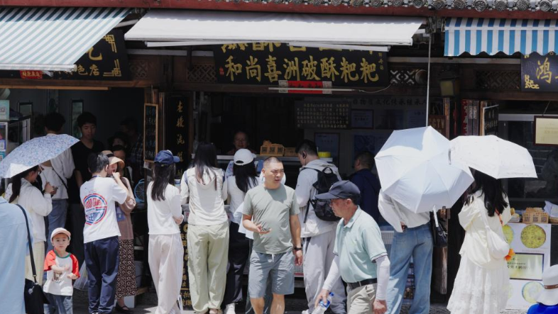 7月3日,喜洲村西坊街,游客们正在购买喜洲粑粑。新华社发(罗晓川摄)