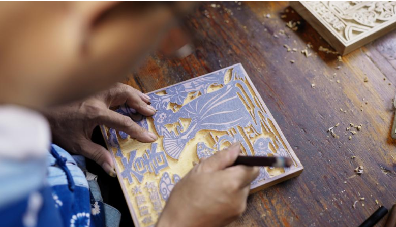 7月5日,喜洲匠志集民艺中心甲马版画艺术馆内,工匠正在雕刻甲马。新华社发(罗晓川摄)