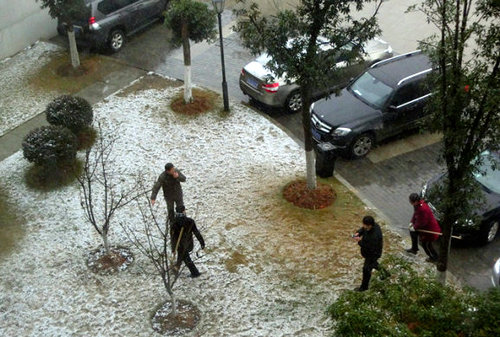 风雪中讨薪民工在湖北交通投资集团数十米高的大楼楼顶僵持了8个多小时